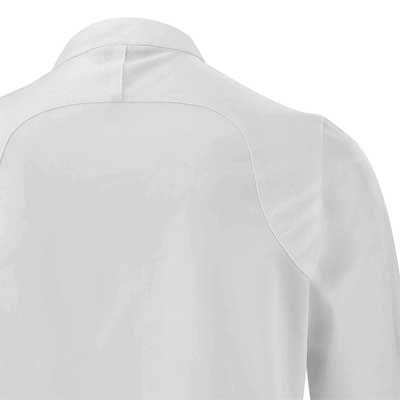 Le col officier plongeant donne une touche contemporaine à l’ensemble tout en assurant un bon maintien. Il permet également d’éviter que la sueur ne s’écoule vers le torse, un détail non négligeable pour le confort du professionnel. Sur la manche gauche, une poche passepoilée discrète permet de ranger facilement un stylo, un thermomètre ou tout autre petit accessoire indispensable.
